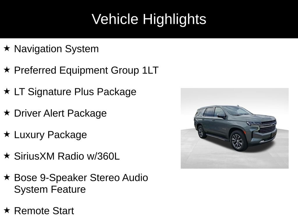 Whether you're taking the family on a road trip or tackling your next adventure, the 2023 Chevrolet Tahoe LT is the perfect companion. With its exceptional capability, advanced technology, and refined interior, this Tahoe is sure to exceed your expectations. Experience the difference for yourself by scheduling a test drive today.